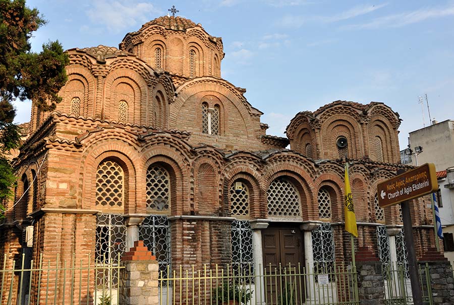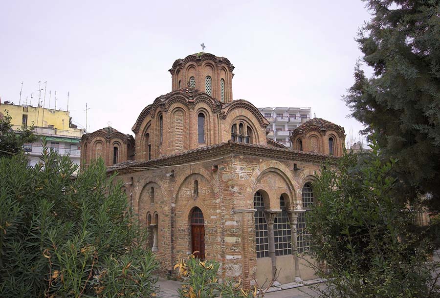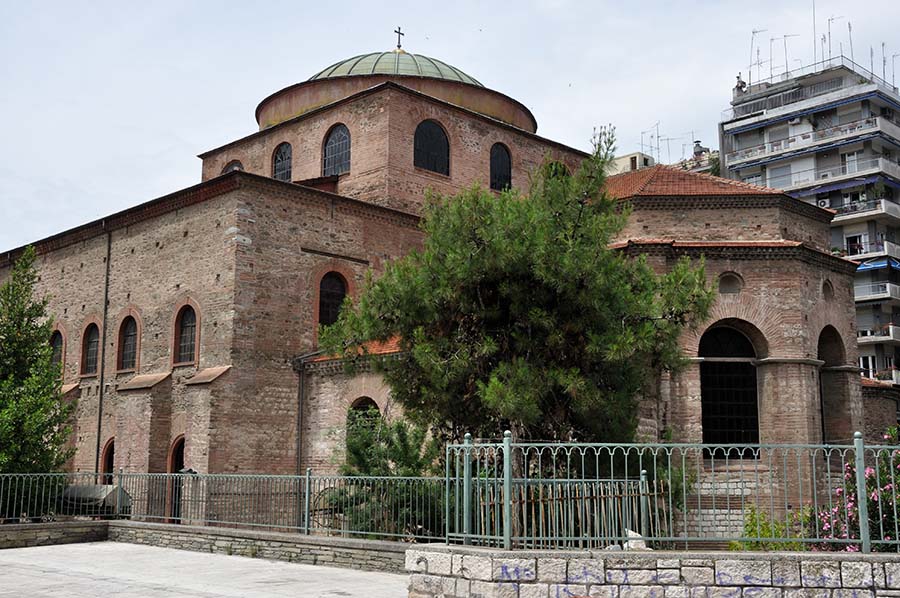 The church of Agios Athanasios is located at the centre of the town, southeast of the church of Acheiropoihtos, at the junction of Egnatia with Socrates Street. As it is testified by the inscription above the southern entrance of the building, the temple was built in 1818. This is a three-naved wooden-roofed basiliva with azenana, an architectural type widespread in Macedonia during the Turkish occupation and particularly in the 19th century. The exterior side of the wall on the west side of the building is very elaborate, with carved stones alternating with brick walls; the walls of the north and south side of the monument are built of irregular stones, including inserted wooden frames. Inside the church the zenana is U-shaped, in other words it is partially extended at the side naves and along the north side there is attached the called makrynariki, a separate elongated hall, which is mostly found in monasteries. The wooden roof of the building is decorated with various geometric shapes, while at its center there is shaped a large wooden-carved navel. The original painted temple has been removed and replaced with a new wooden temple, in which have been adapted old icons dated back to 16th, 18th and 19th century.