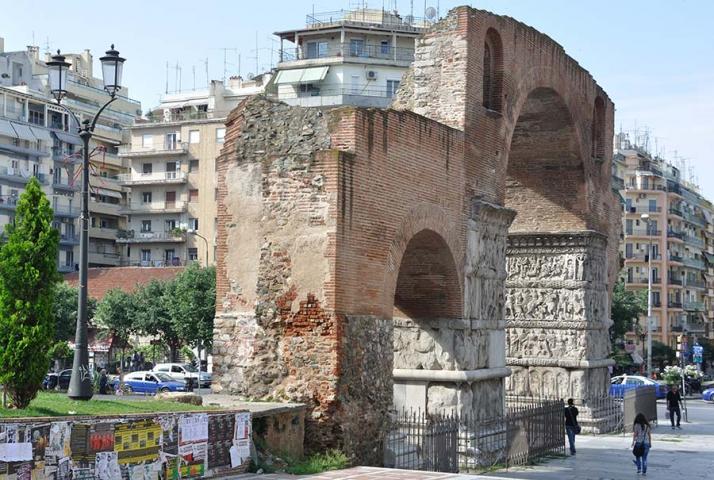 Nowadays, only some parts of it still remain in good condition: the eastern side is missing completely from the two parallel walls; on its western side, only two out of the three arched openings (the central and the northern on its side) as well as three out of the four columns (the two main columns and the northern one out of the secondary ones). On the surface of these two main columns that have survived, we can find marble plates with carved illustrations, depicting scenes from the glorious and victorious Galerius expedition in Anatolia versus the Persians in 297. These scenes are being developed in successive zones, characterized by the number and the density of the episodes and the images represented, while constituting in the same time characteristic art samples of the post antiquity era.